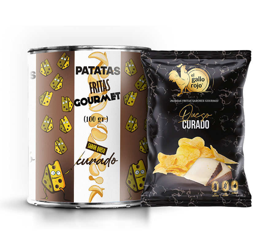 Lata PERSONALIZADA con Patatas Fritas Gourmet Queso Curado de 100 gramos El Gallo Rojo.