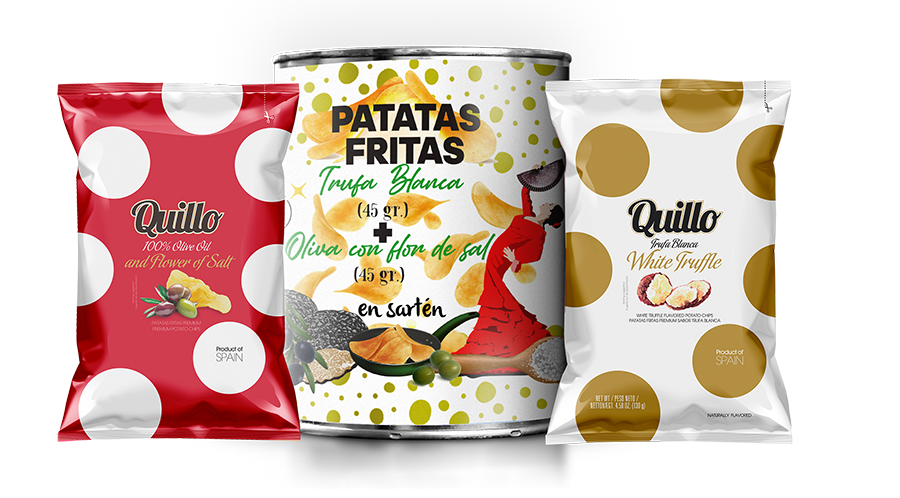 Lata PERSONALIZADA con Patatas Fritas Trufa Blanca Quillo de 45 gramos y Patatas Fritas con Aceite de Oliva y Flor de Sal Quillo de 45 gramos.